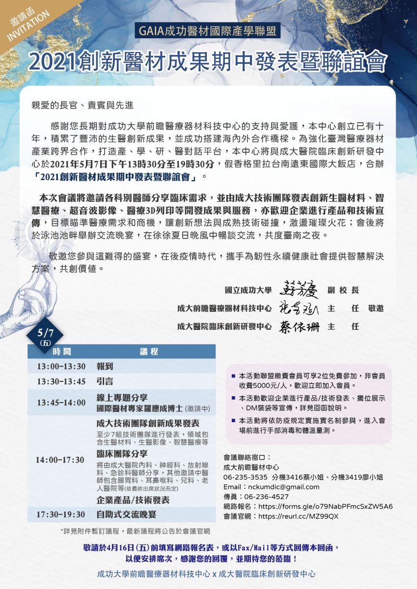 NCKU x NCKUH organize 2021 Annual Meeting on Emerging and Innovative MedTech on May 7 2021, in order to foster partnership and cooperation between academics, hospitals, officials and industry leaders. The event will bring with technology presentations of outstanding teams from NCKU, NCKUH as well as Taiwan enterprises to share their ideas on biomedical materials, Smart Healthcare, Biomedical Ultrasound Imaging, 3D printing in Medical Applications, and so on. Participants can enjoy a alfresco poolside banquet to exchange their wonderful ideas and thoughts after presentation sessions.