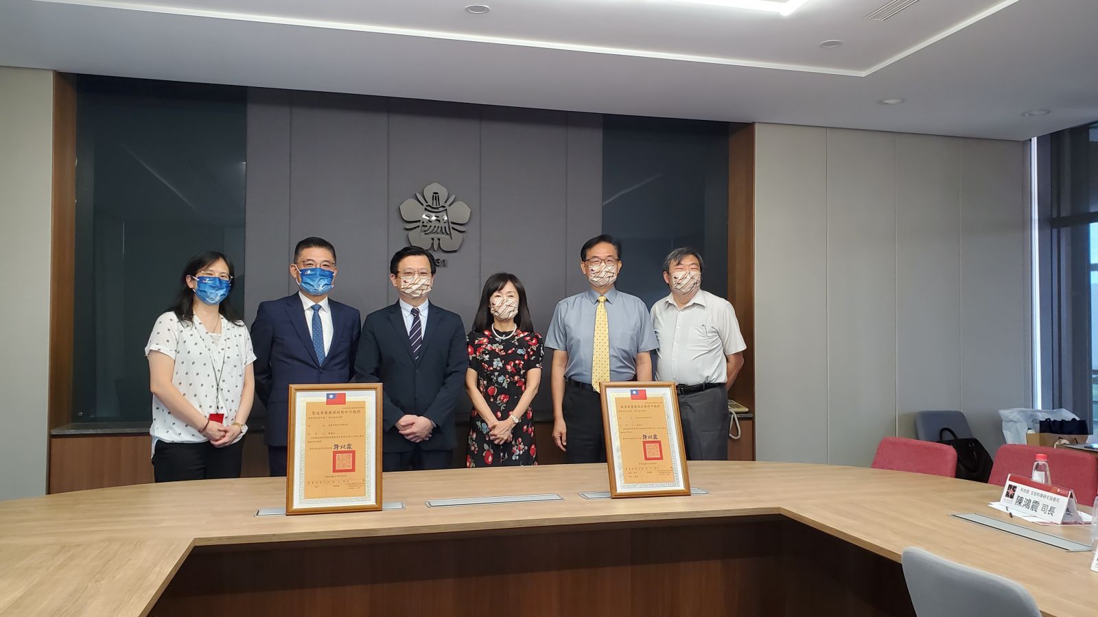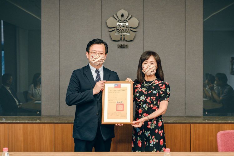 台南市衛生局長(左)許以霖頒贈許可證,由成大校長蘇慧貞(右)代表接受。