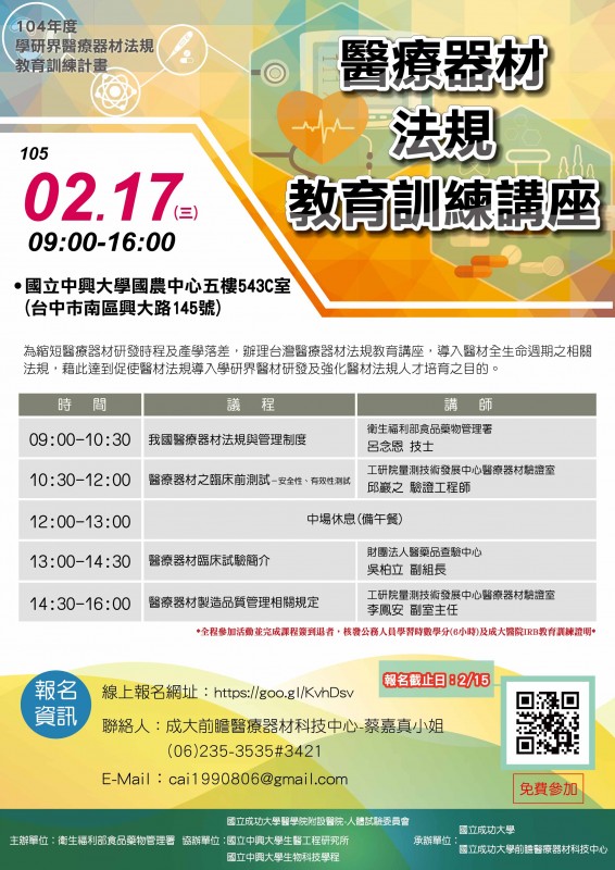 為縮短醫療器材研發時程及產學落差,辦理台灣醫療器材法規教育講座,導入醫材全生命週期之相關法規,藉此達到促使醫材法規導入學研界醫材研發及強化醫材法規人才培育之目的。