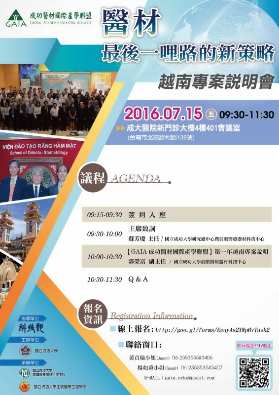 7/15 誠摯邀請各位聯盟會員、業界先進參與 【GAIA 成功醫材國際產學聯盟 】於成大舉辦之越南專案說明會,期許雙方攜手,共同開發與深耕東南亞醫材市場,創造更大的產業價值與國際市場。
