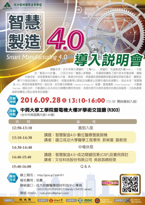 目前隨著各國人口逐漸高齡化,醫療衛生保健成為重要議題,數位化醫療不僅能提高診斷品質及效率,並隨著通訊技術發展成熟與行動裝置的整合、雲端運算與大數據分析等應用,使網路通訊成為數位醫療的一大利器,另外目前醫療檢測設備智慧化亦發展迅速,除了硬體的行動裝置之外,軟體方面的app、軟體平台,乃至於傳輸服務以及應用服務,都將是潛力無窮的相關產業商機,且目前不少大公司已紛紛進軍醫電科技、醫療平台等領域,將有助整合不同服務並建立更多資訊與醫療智慧化的平台。本次【成功醫材國際產學聯盟】於 9月28日【智慧製造4.0 導入說明會】 (台中場) 說明會特別安排『 成功大學前瞻醫療器材科技中心 郭榮富副主任』主講 [智慧製造4.0 -數位醫療發展契機 ] 及『文佳科技股份有限公司 吳啟昌總經理』 主講 [智慧製造4.0-成功關鍵因素(CSF)及實例探討] ,敬邀聯盟會員與產業先進蒞臨與會,透過案例分享與說明的互動交流,希望貴公司在面臨全球快速發展趨勢下,優先掌握產業發展契機與競爭利基。