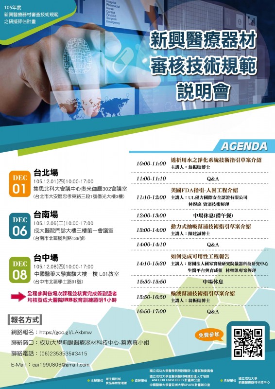 為協助產學研界開發,擬制定相關技術基準草案,成功大學前瞻醫療器材科技中心辦理新興醫療器材審核技術規範說明會,歡迎各界先進踴躍報名參加。