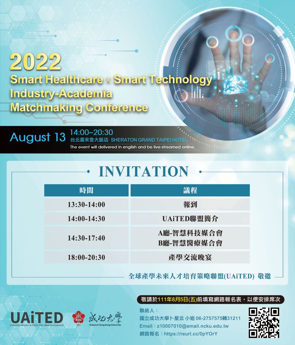 國立成功大學暨全球產學未來人才培育策略聯盟(UAiTED) 謹訂於111年8月13日(六)辦理2022 Industry-Academia Matchmaking Conference產學合作研發媒合會,